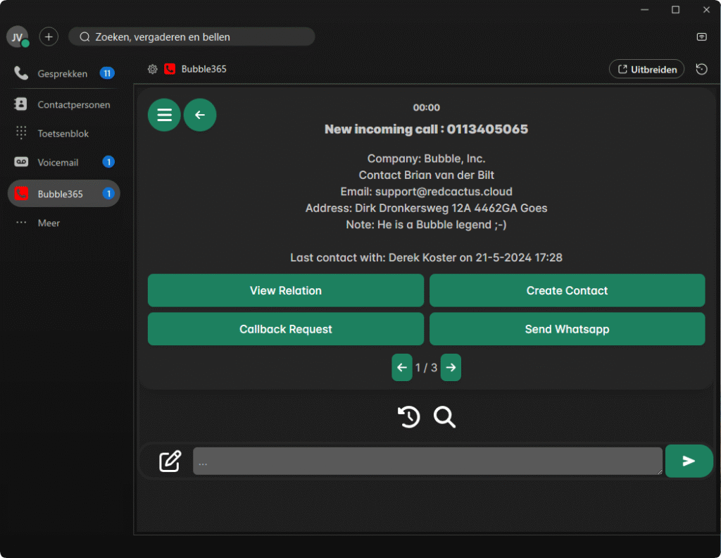 ij een inkomende oproep opent automatisch een pop-up met de klantkaart uit je CRM. Je ziet meteen wie belt, eerdere gesprekken en notities. Zo kan je direct de juiste service bieden.